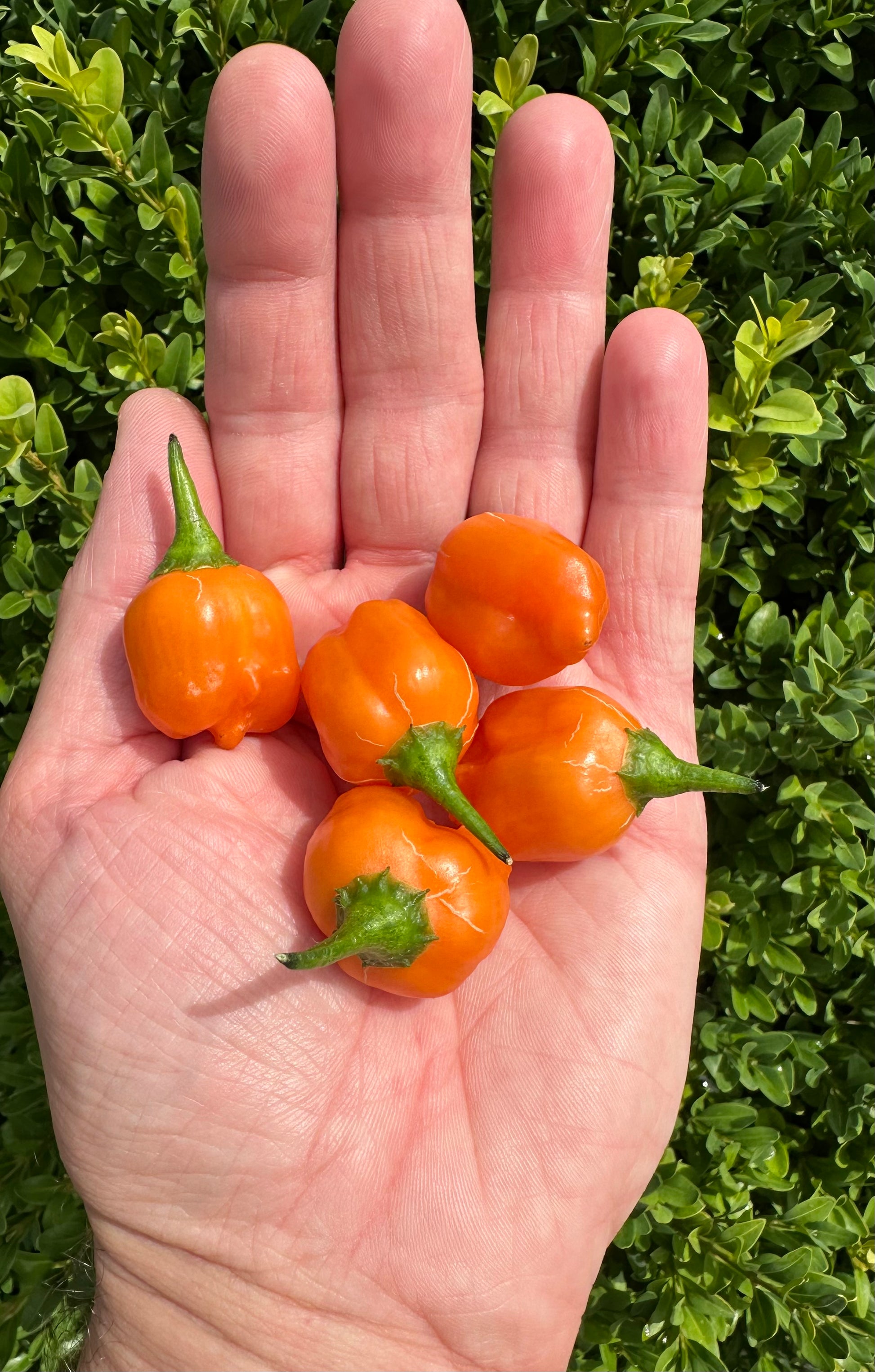 Eine andere Variante oder Phänotyp der bekannten länglichen Aji Mango. Etwas milder, aber sehr aromatisch. Bei dem Scovillewert gehen die Meinungen auseinander, dieser soll 30.000 - 150.000 SHU betragen.