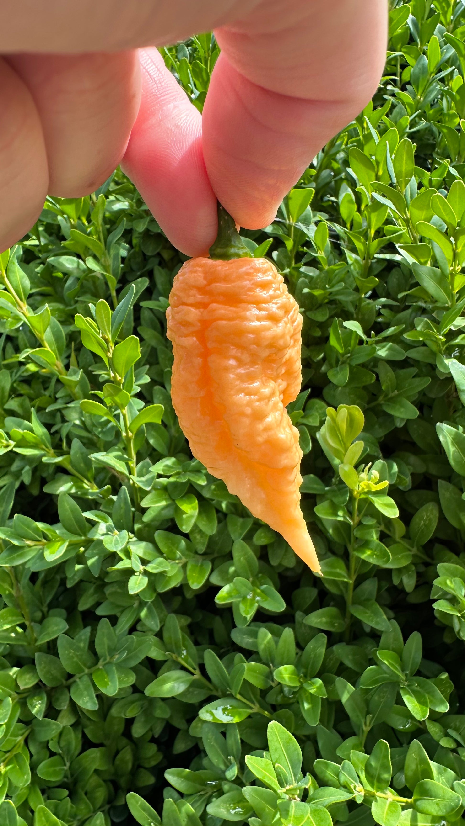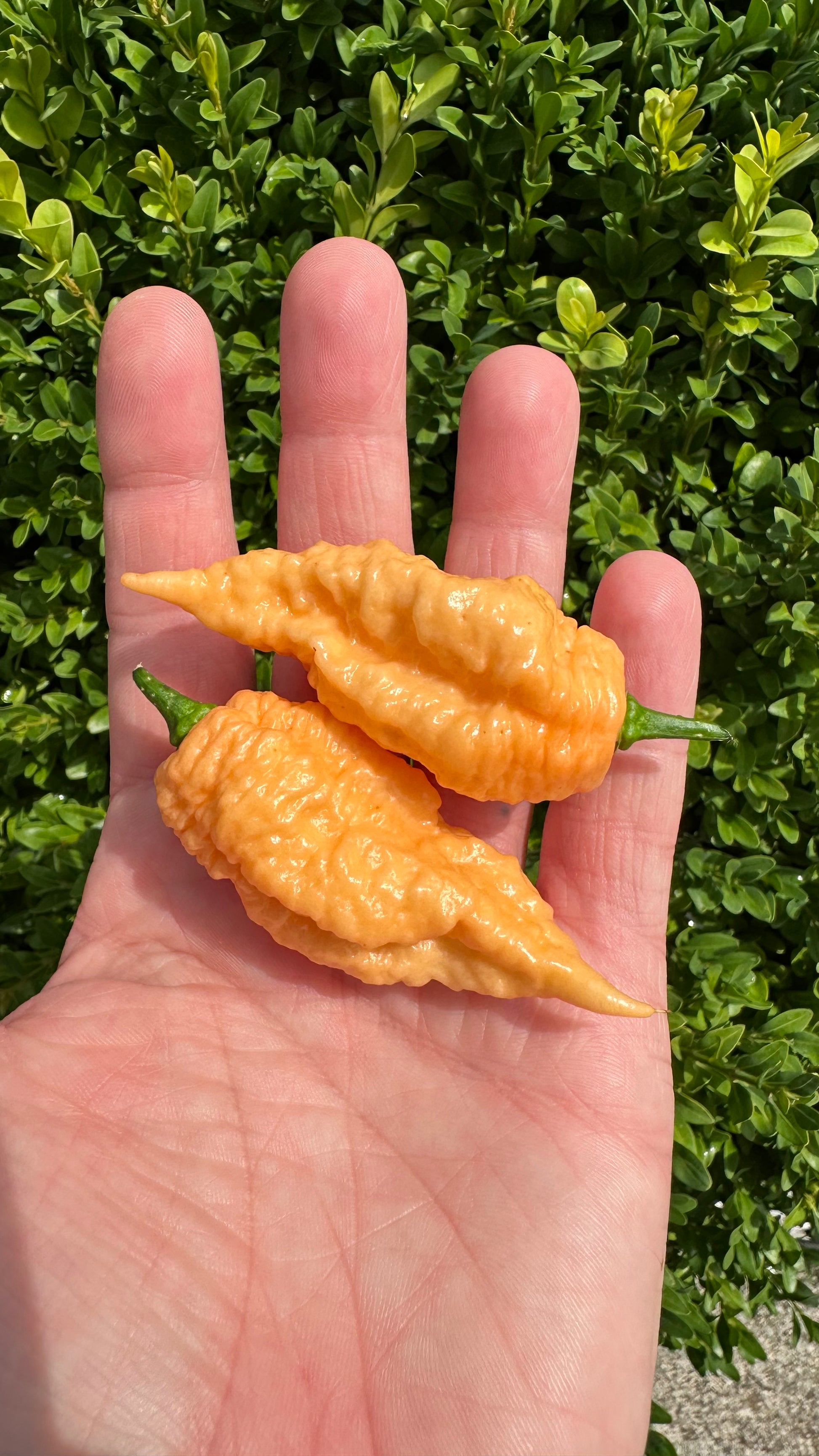 Sie kombiniert kalifornische Coolness mit brutaler Schärfe - eine Chili, die nicht fragt. Sie brennt einfach. Fruchtig, rauchig...dann kommt die Hölle. Reift von grün nach pfirsich-/goldfarben.